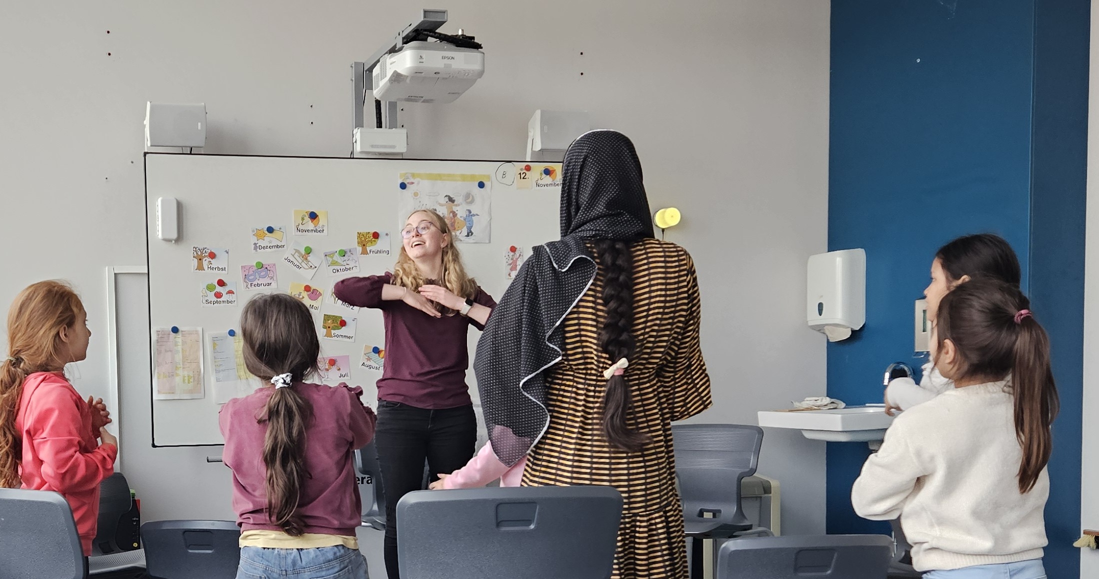 Studierende erproben gemeinsam mit Prof. Christin Werner und Elke Kottmair dramapädagogische Tools mit acht Schülerinnen und Schülern der DaZ-Klasse (Deutsch als Zweitsprache). Durch szenisches Spiel, Musik und kreative Ausdrucksformen werden Sprachkompetenzen gezielt gefördert und die Motivation zum Deutschlernen gestärkt. Die DaZ-Lehrerin und die Gruppe freuen sich jede Woche sehr auf die Studierenden. Die Studierenden wiederum staunen, wie sich die Kinder von Woche zu Woche entwickeln und mit Freude die vielseitigen Übungen umsetzen. Die stellvertretende Schulleiterin Frau Bandemer bedankt sich: „Wie schön, dass Sie unseren Kindern dieses tolle Projekt ermöglichen!“