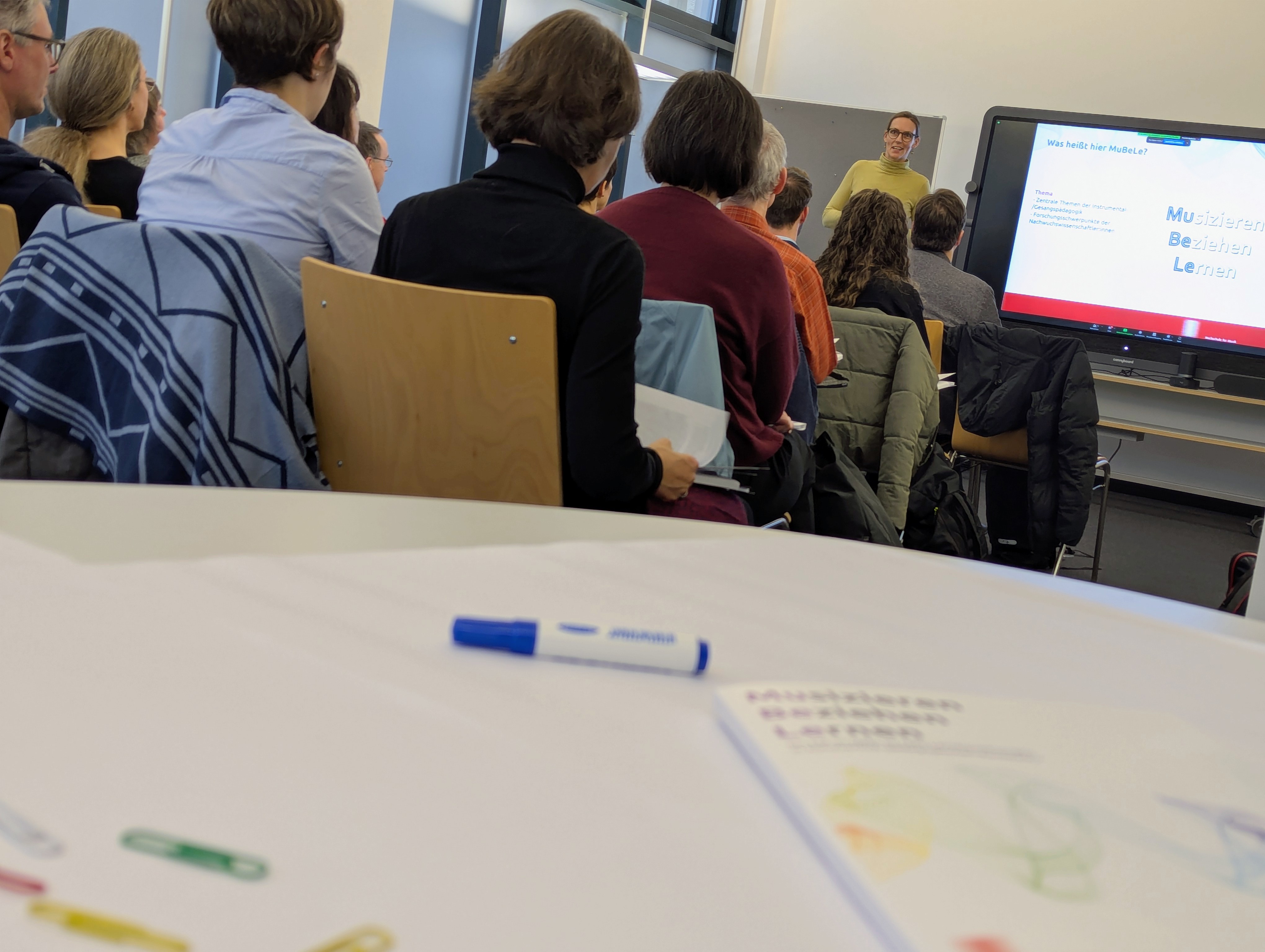 Mit einer gut besuchten Abschlusspräsentation fand das Projekt Musizieren – Beziehen – Lernen (MuBeLe)seinen erfolgreichen Abschluss. Insgesamt nahmen ca. 45Teilnehmerinnen und Teilnehmer aus Hochschule, Praxis und weiteren Partnerinstitutionen sowohl in Präsenz als auch online teil. Im Rahmen von vier interaktiven Workshops wurden Zwischenergebnisse des Projekts vorgestellt und diskutiert. Die Teilnehmenden hatten die Möglichkeit, Rückmeldungen zu geben, Ideen weiterzuentwickeln und gemeinsam Perspektiven für die zukünftige Umsetzung zu erarbeiten. Ein besonderer Höhepunkt der Veranstaltung war die offizielle Übergabe der "Empfehlungen zur Studiengangsentwicklung" an den Rektor der Hochschule Lars Seniuk durch die Projektleiterin Katharina Bradler. Die Veranstaltung zeigte deutlich, wie wertvoll der offene, konstruktive Austausch zwischen allen Beteiligten ist – und dass die im Projekt entwickelten Ansätze großes Potenzial für die zukünftige Hochschulentwicklung besitzen.