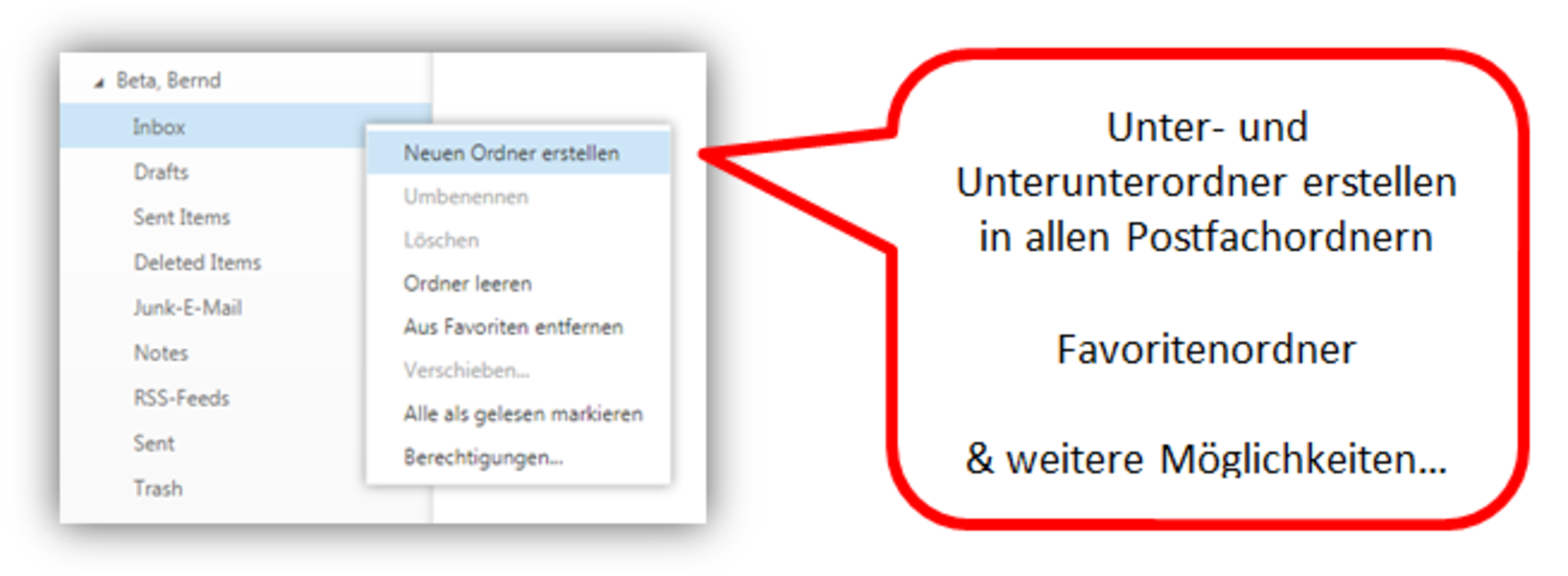 Unter Postfachordnersystem können Sie mittels der rechten Maustaste zusätzliche Unterordner erstellen, worin Sie händig oder über eine definierte Regel eingehende E-Mails automatisch einsortieren können. Beachten Sie, dass die Sender als Kontakt oder Gruppe in Ihrem Postfach eingetragen wurden (unter Personen). Andernfalls sehen Sie alle eingehenden Mails unter Inbox bzw. Junk (Posteingang bzw. Spam).
