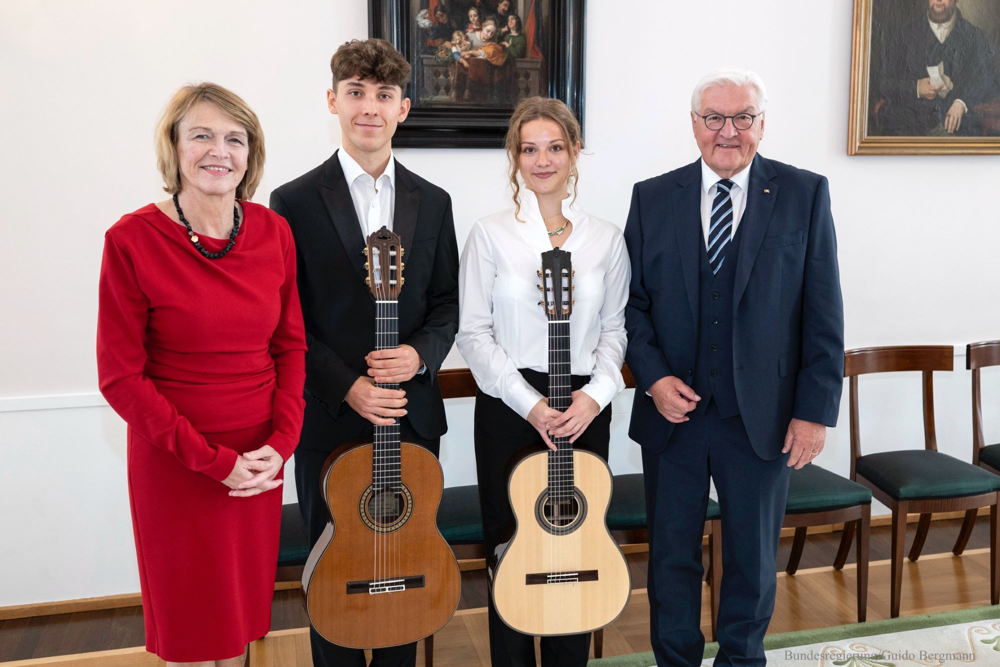 Dorotea Dolenec und Viktor Stryapin, beide Akustische Gitarre (Klasse Prof. Thomas Fellow), haben gemeinsam im Gitarrenduett die musikalische Gestaltung der Verleihung des Verdienstordens der Bundesrepublik Deutschland zum Tag der Deutschen Einheit am 1. Oktober 2025 im Schloss Bellevue übernehmen dürfen.